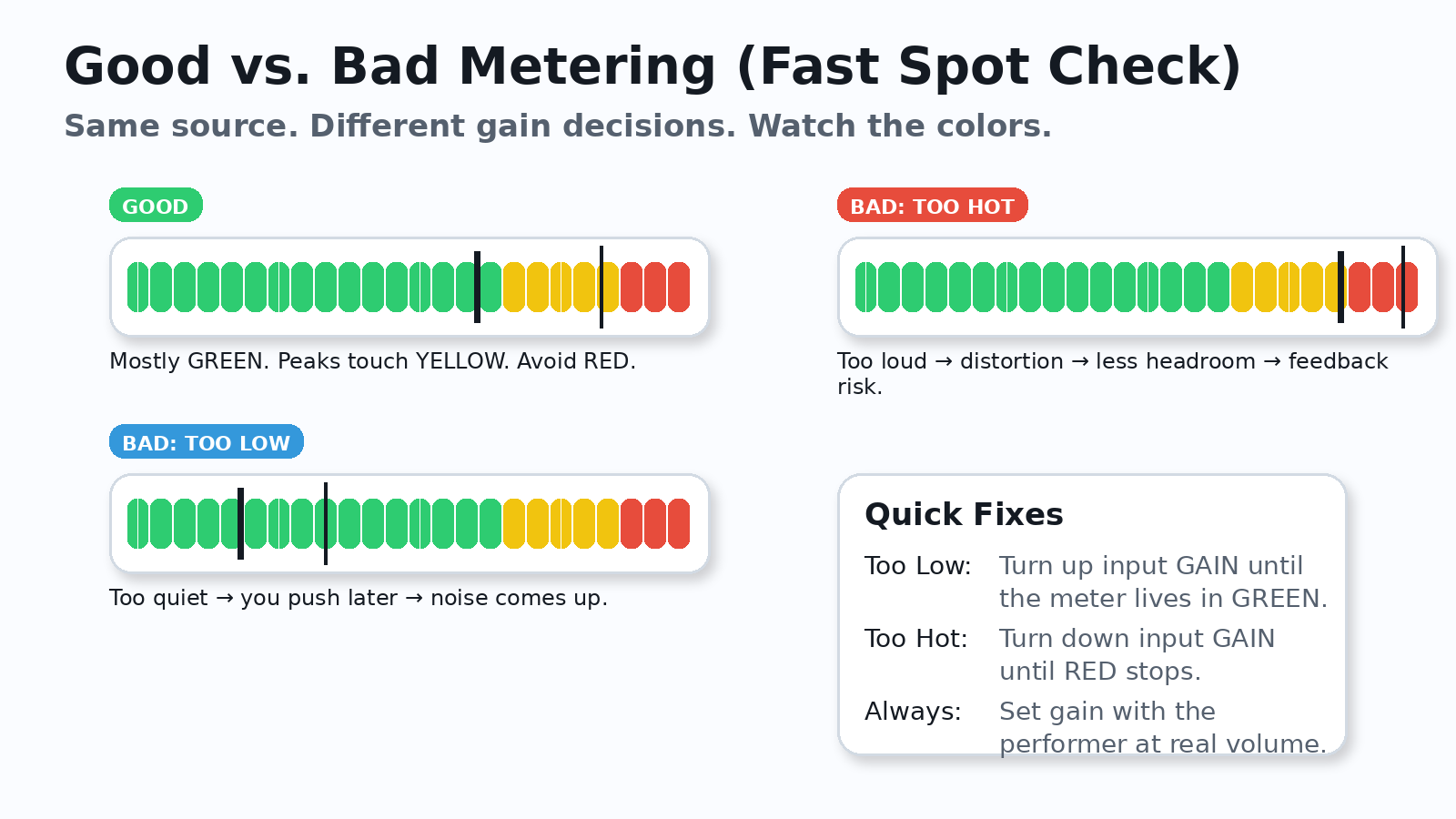 Too low = noise later. Too hot = distortion now. Good = mostly green.