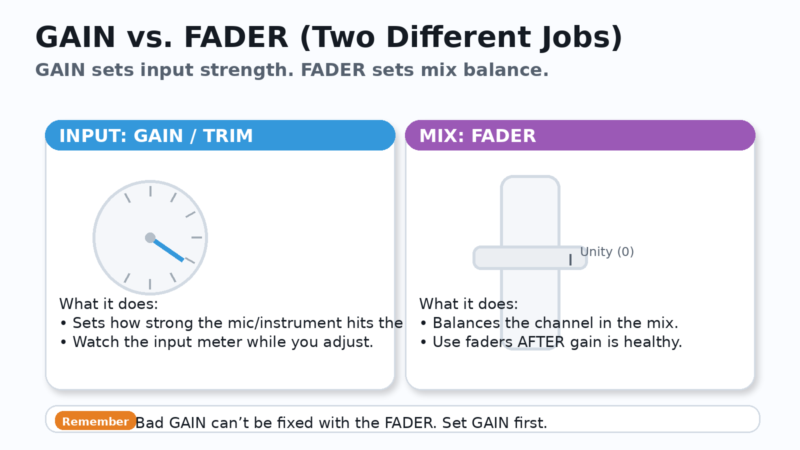 GAIN sets input strength (headroom). FADER places the channel in the mix (balance).